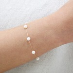 | アコヤ真珠を等間隔に留めたステーションブレスレット、長さ調整が細やかに出来るアジャスターチェーン付きなので取り外しもしやすくお使いいただけます。地金は18金かプラチナからお選びください。 |